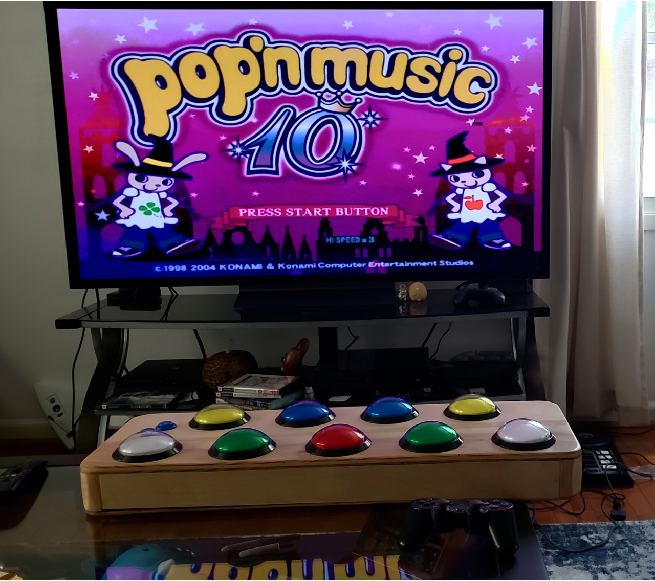 I was in Japan in January and bought a bunch of stuff from Book Off/Hard Off (which I highly recommend; Hard off is your dream place). I got a half-dozen Pop'n Music games and a Japan-region PlayStation 2. I also got an official Pop'n Music controller. It isn't very good (rubber dome switches and is much smaller than the arcade), so I decided to build my own arcade-style controller (for which there are several resources and examples; there's also official arcade size controllers and the Popoller).