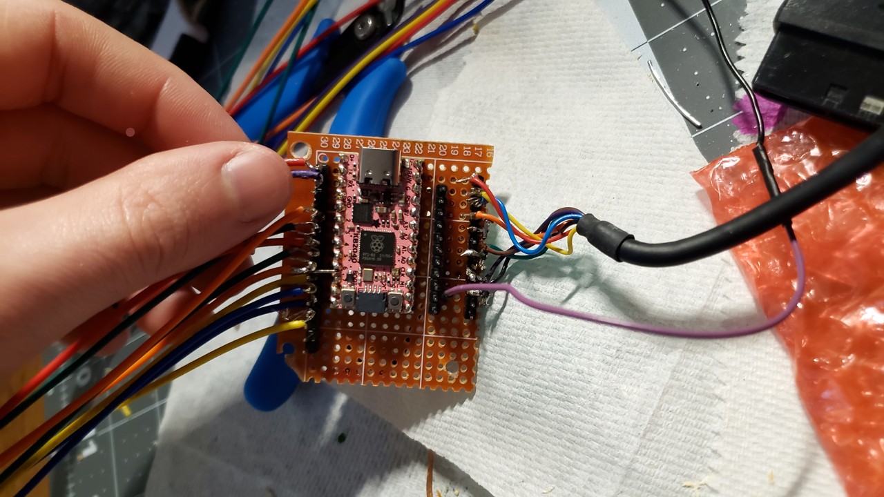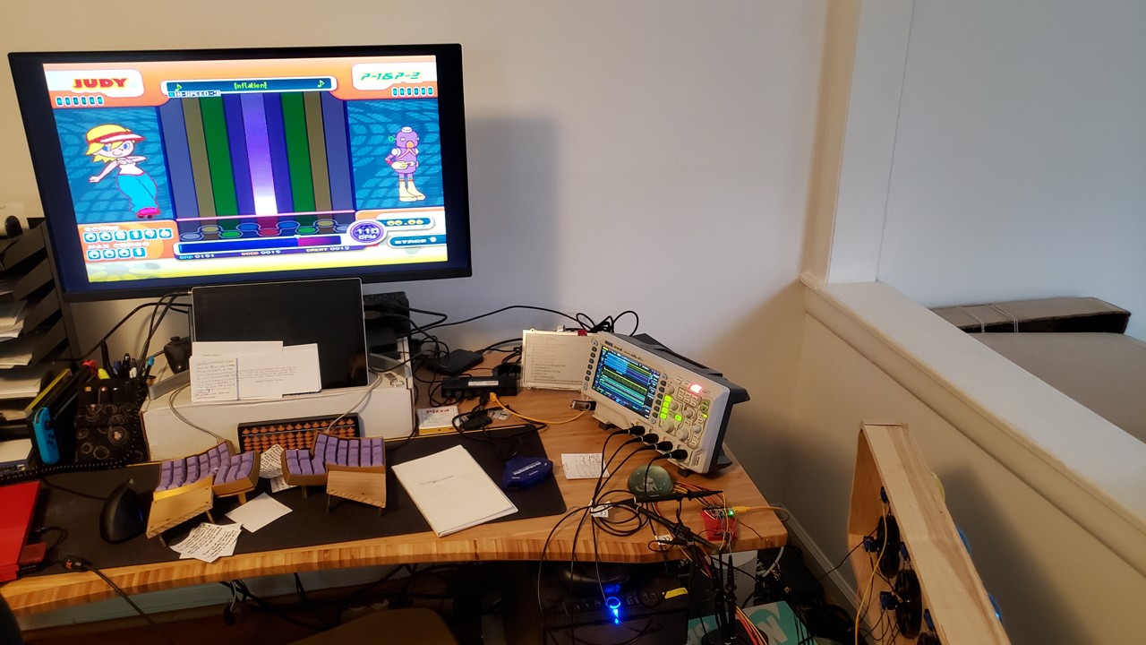I later discovered that the Playstation version had unacceptable latency. My wife and I chatted about it and she helped me realize that the problem was in my firmware. The RP2040 PIO has a 4-deep FIFO queue for inputs/outputs. On the keyboard mode the queue would be drained immediately (i.e. it was event-based), but with the Playstation it was sample-based, so it would always be 4 samples behind. I now flush the queue before sampling, which completely fixed the latency. It was satisfying to realize this fix just by thinking it through rather than having to do a lot of experimentation to find it.