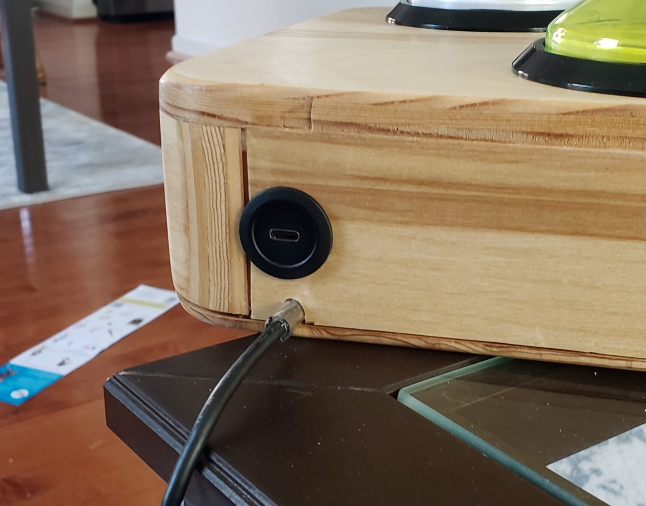 I bought a USB C Round Panel Mount Extension Cable which makes connecting via USB feel professional. I also cut a length of silicone tubing to act as a strain reliever for where the Playstation controller wire exits the enclosure.