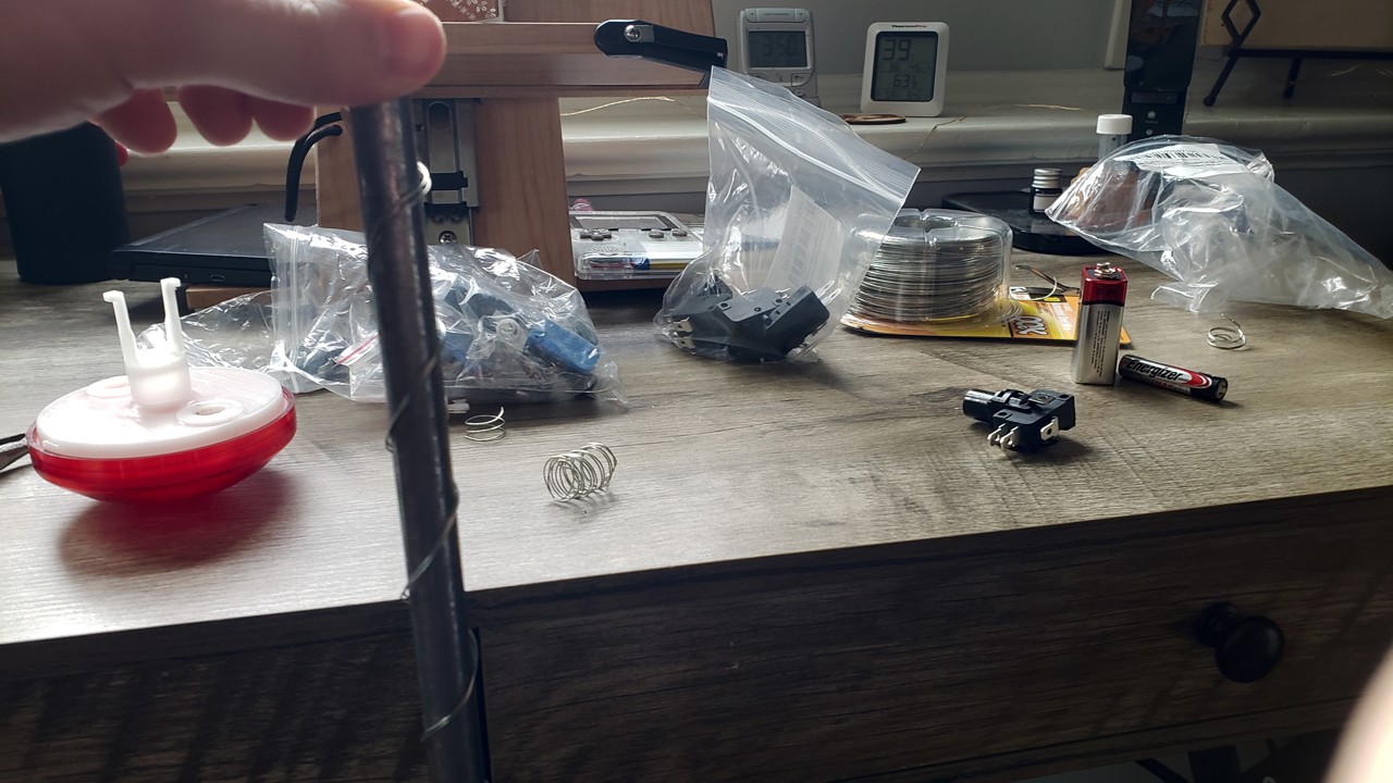 This was then paired with a feather ~30g Zippy micro-switch for a reasonably light feel. The problem with this is that the clickiness from the micro-switch is lost due to the weight of the button and spring, making the button press feel a bit mushy. I'm still happy enough with it and I think it's cool that I wound my own spring, so I left the red button with it in.