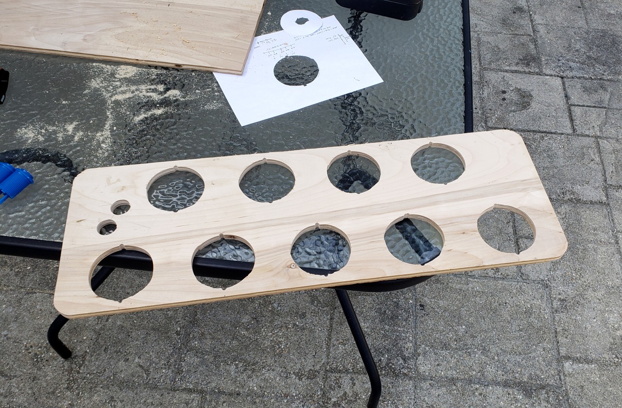 I hand-cut each button hole with my jig saw. These are a bit rough and had to be filed and sanded a bit to fit the buttons, but because they are hidden by the button flange, it doesn't really matter as long as they are snug.